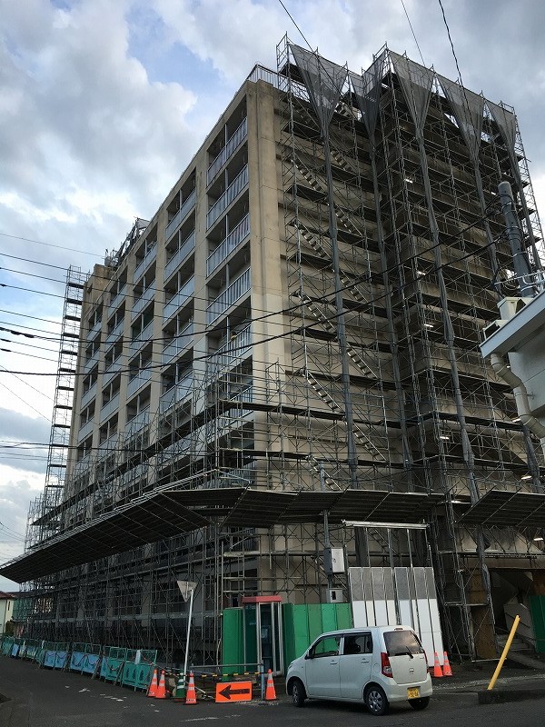 大学の職員寮の改修工事に関する仮囲い及び足場工事など。